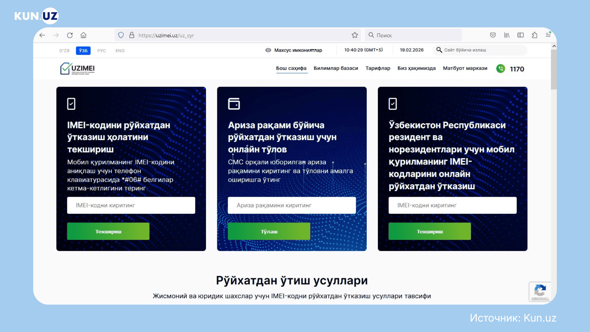 Go to uzimei.uz and enter the IMEI code in the Online registration of mobile device IMEI codes field.