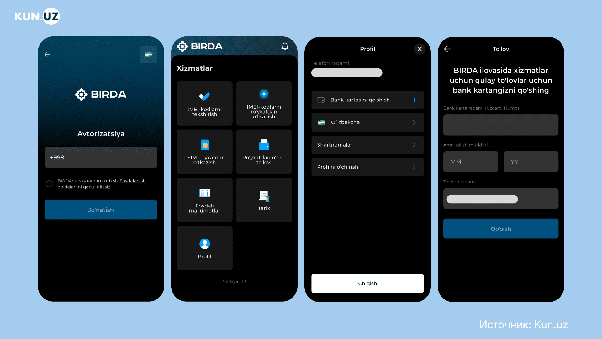 Install and open the Birda app. Log in to your profile using your phone number. Before registering IMEI codes, add a bank card to your profile for payment. Tap Add bank card, enter the card number and expiration date, then tap Add again. You will receive an SMS with a confirmation code.
