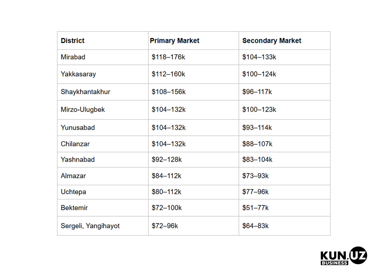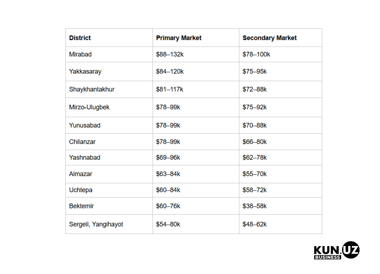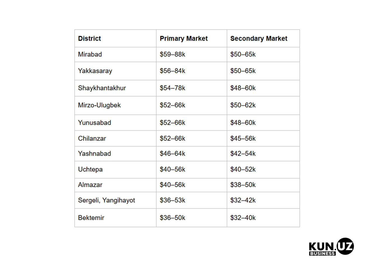 The largest gap between new developments and the secondary market is in Mirabad, Yakkasaray, and Shaykhantakhur. In Bektemir and Sergeli, the difference is minimal — $4,000–8,000.