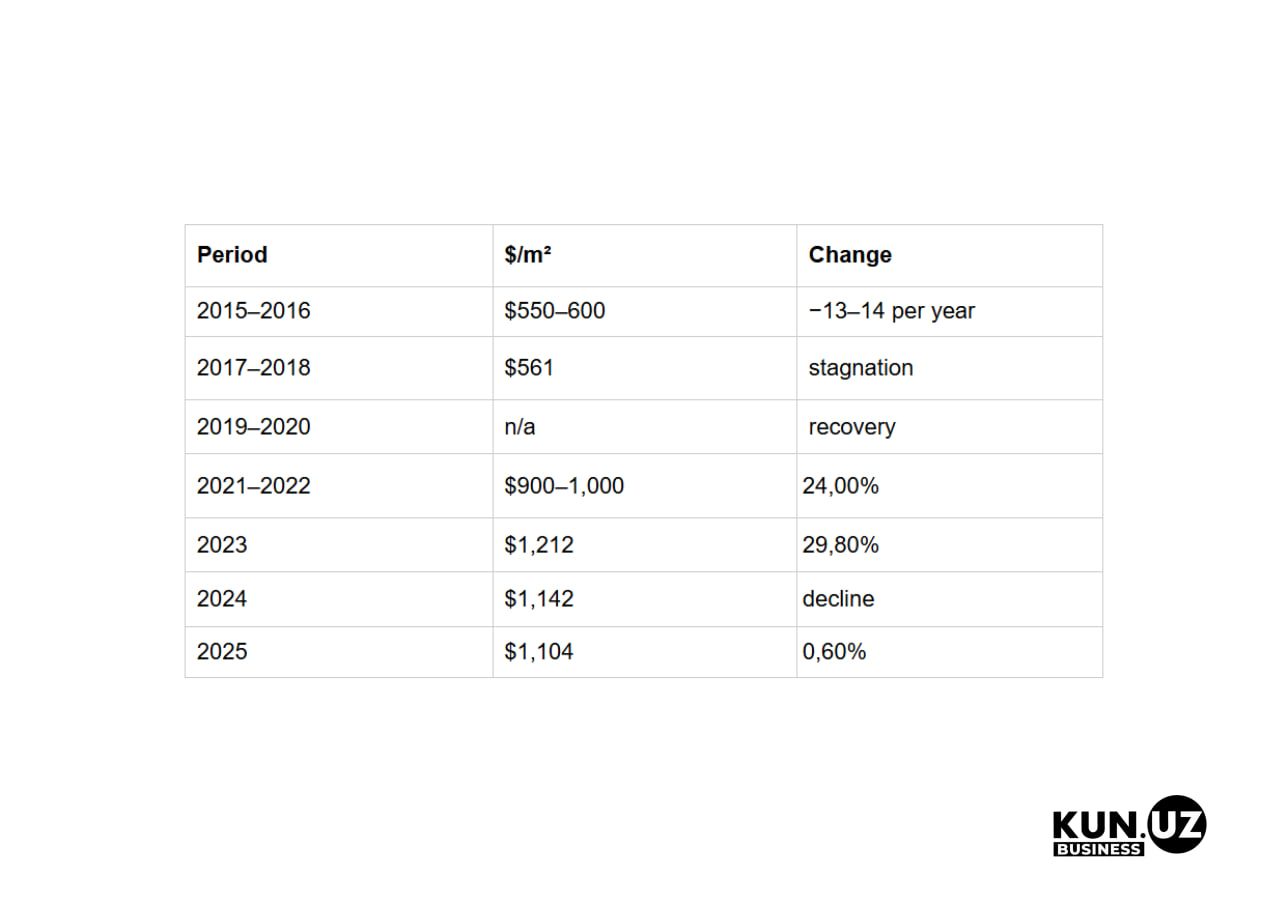 Over the past decade, housing prices in Tashkent have gone through several phases: a decline, several years of near stagnation, and a sharp increase in 2021–2023. In recent years, price growth has slowed.