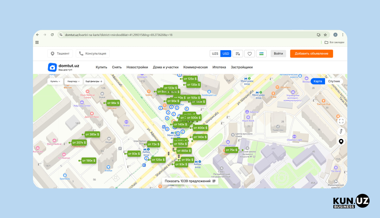 For the analysis, we calculated apartment prices based on the price per square meter and compared offers across districts. Prices were converted into US dollars using the Central Bank exchange rate for February 2026 — 12,179 UZS per USD.
