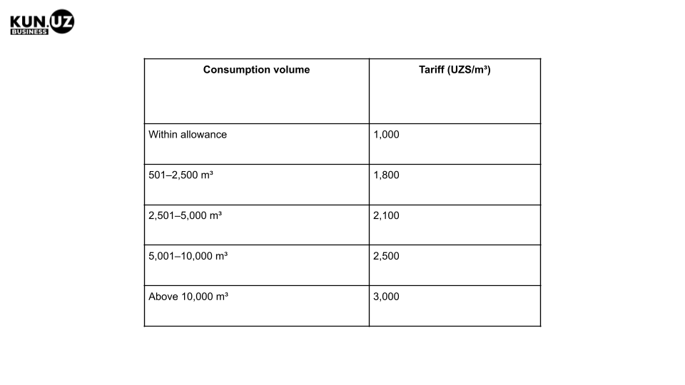 - if consumption is up to 500 m³ — the entire volume is charged at 1,000 UZS per m³