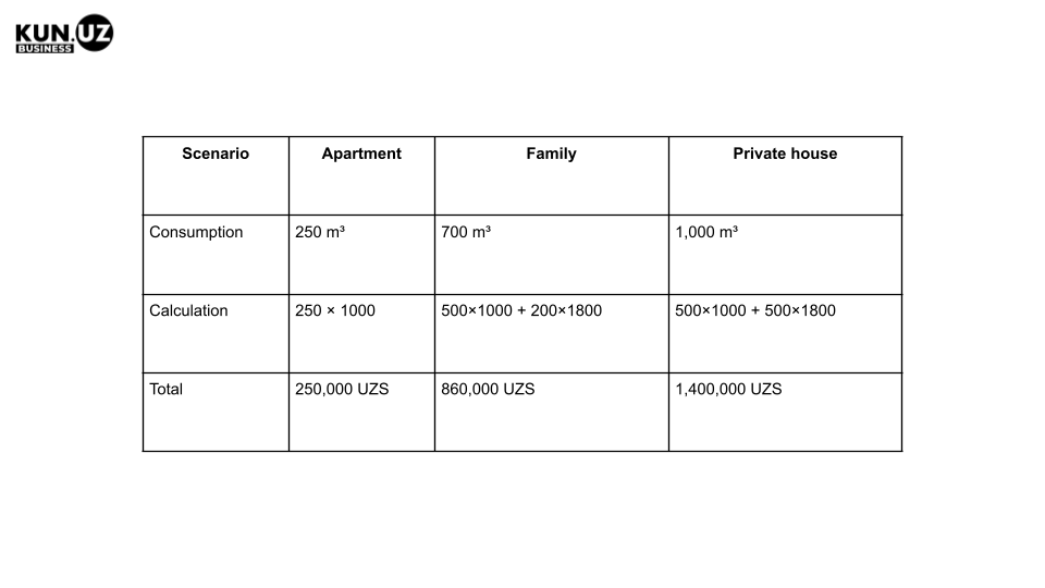 - 1,800 UZS per m³ — for cooking and hot water