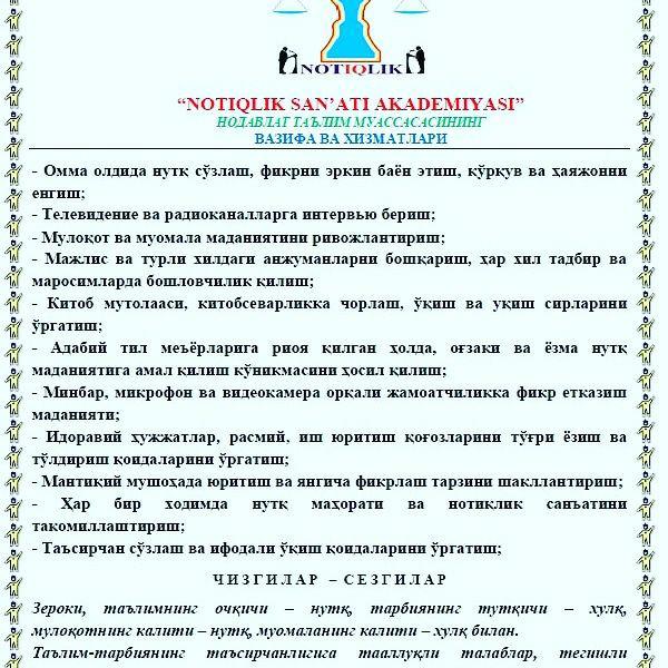 «Нотиқлик санъати академияси» нодавлат таълим муассасаси нутқ маҳорати ва нотиқлик санъатини эгаллаш истагида бўлганларни чорлайди. Муассаса ўз ўқувчиларига қуйидаги билимларни ўргатади: