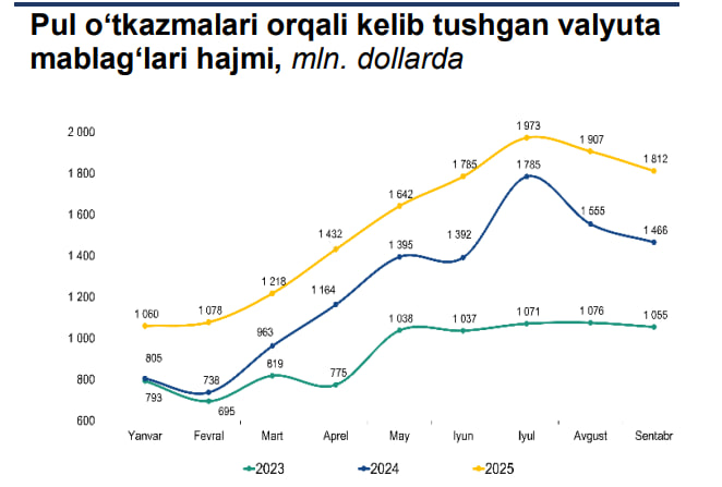 2025 йилнинг январ-сентябр ойларида Ўзбекистонга халқаро пул ўтказмалари 13,9 млрд долларни ташкил этиб, ўтган йилнинг мос даврига нисбатан 24 фоизга (2,7 млрд доллар), 2023 йилга нисбатан эса 66 фоизга (5,5 млрд доллар) ўсди.