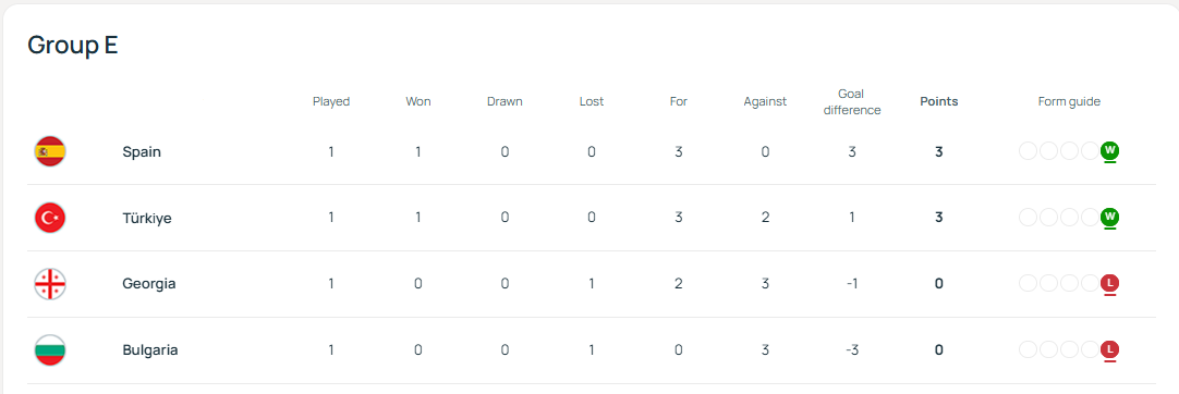 Европанинг амалдаги чемпионлари саралаш циклини жуда кучли бошлаб, сафардаги ўйиннинг биринчи бўлимидаёқ болгарлар дарвозасига учта гол йўллади. Испаниянинг 2025 йилдаги энг сермаҳсул футболчиси Ойярсабал (4+2) 5-дақиқадаёқ ҳисобни очди. Унинг «Реал Соседад»даги собиқ жамоадоши, шу ёзда «Арсенал»га ўтган Субименди уни голли пас билан таъминлади. Кейин эса Ямал катта саҳнага чиқди. У ўзи гол урмади, лекин барча голларда иштирок этди. Биринчи гол ҳам унинг қанотида бошланган ҳужум якунида урилганди, бўлим ўрталаридан ўтганда Ламиннинг узатмасидан кейин Кукуреля тўпни дарвозага михлаб қўйди, бироз ўтиб у бурчакдан оширган тўпни «Реал Соседад»дан «Арсенал»га ўтган яна бир футболчи Мерино ўз услубида тўрга жойлади. Шундан кейин Луис де ла Фуэнте шогирдлари икки кундан кейин Туркияда кечадиган ўйин учун куч тежаш мақсадида тежамкор режимда ўйнашга ўтди, аммо шундан кейин ҳам мезбонлар дарвозаси олдида кетма-кет хавфли вазиятлар яратилди (Меринонинг яна бир зарбаси дарвоза тўсинига борди). Пайшанба оқшомидаги эътиборга молик воқеалардан бири «қизил фурия» сафида 19 ёшли Хесус Родригес дебют қилиши бўлди, ўтган мавсумда «Бетис» сафида порлаган ушбу ёш футболчи ёзда 22,5 млн евро эвазига «Комо»га трансфер қилинди.