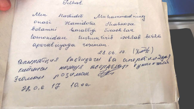 “Шифокорларнинг барча амалий чораларни кўришига қарамасдан бемор аҳволи оғир бўлган. Жарроҳ ушбу мураккаб вазиятни беморнинг қариндошларига тушунтирган. Шундан сўнг беморнинг бувиси болани уйга олиб кетмоқчи бўлади. Шифокорларнинг рухсат бермаслигига қарамай, тилхат асосида 28 июнь куни соат 19:30 да бемор Муҳаммад Рашидовни уйга олиб кетган.