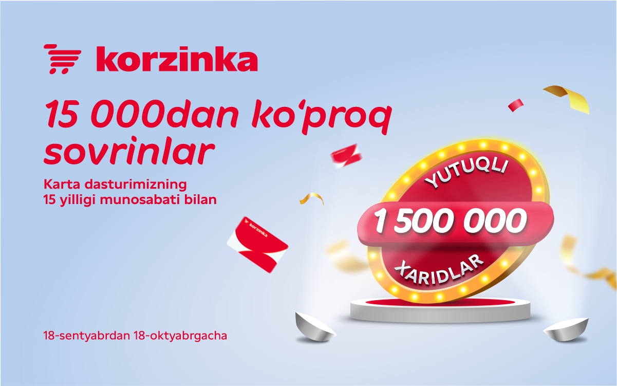 Корзинка супермаркетлар тармоғи 2023 йилда Korzinka Plus Карта дастурининг 15 йиллигини нишонламоқда. Компания аъзолари муҳим санани нишонлаш мақсадида 15 000дан кўпроқ совринли катта акцияни тақдим этдилар. “Ютуқли харидлар” мини ўйини билан энди харидорларнинг ҳар бири соврин ютиш учун кўпроқ имконга эга бўладилар.