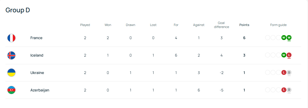 Франция бор гуруҳда қолганлар иккинчи ўрин (ва ўтиш ўйинларига ўтиш имкониятига эга бўлиш) учун курашишади. Гуруҳда қолган уч жамоада ҳам имконият тенг кўринмоқда, Фернанду Сантушнинг истеъфосидан кейин Озарбойжон жамоаси ҳам жонланди. Ёшлар жамоасида ишлаб келган Айхан Аббасов бошқарувида кавказликлар Украинадан очко олишди. Сергей Ребров шогирдлари эса биринчи турда бетараф майдонда французларга ютқазганди (0:2), энди Бокуда бир очко билан кифояланишга мажбур бўлишди.