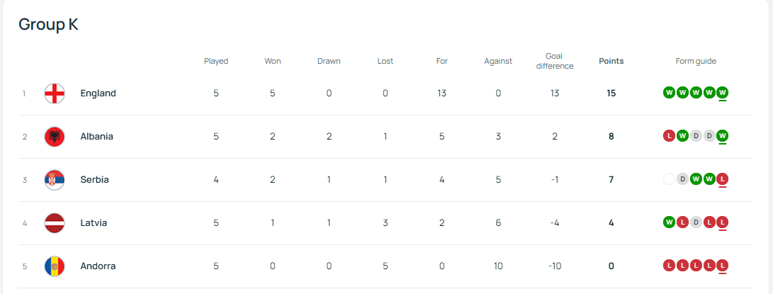 Англия терма жамоаси ҳозирча Томас Тухел бошқарувида саралаш босқичини идеал ўтказмоқда – беш ўйинда беш ғалаба. Бу сафар гуруҳдаги энг яқин таъқибчи серблар сафарда тор-мор этилди. Бурчак зарбаси ижро этилганида Ҳарри Кейн қўриқланмади – биринчи гол қабул қилиб олинди. Тезкор Нони Мадуэке қўйиб юборилди – иккинчи тўп дарвозадан олиб чиқилди. Инглизлар бир неча дақиқа ичида ўйинни ҳал қилишди.