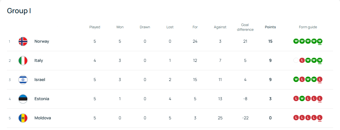 Женнаро Гаттузо бошқарувидаги Италия иккинчи ўрин учун Исроил билан кураш олиб бораётган маҳалда, Норвегия ўз орзуси томон шахдам қадам ташламоқда. Скандинавларнинг навбатдаги қурбони бебахт молдованлар бўлишди. Ўз-ўзидан асосий диққат марказида Эрлинг Ҳоланд бўлди. «Манчестер Сити» шу куни истаганича кўнгилхушлик қилди, аввалига Феликс Хорн Мюрени бўш дарвоза қаршисига чиқарди, кейин Эдегор ёрдамида биринчи бўлимнинг ўзида учта гол урди, танаффусдан кейин эса пента-трикни нишонлади. Унинг терма жамоада урган голлари сони ўтказган ўйинлари сонидан ошиб кетди – 45 ўйинда 48 гол.