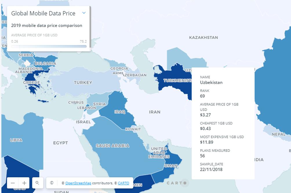 Ҳозирча интернетнинг ўртача баҳосини билдирувчи Worldwide mobile data pricing рейтинги ўтган йилдан буён янгиланмасдан турибди. 2018 йил ноябрь ойига асосланган маълумотларга кўра, тадқиқотчилар Ўзбекистонни 230 давлат ичида 69-ўринга жойлаштиришган.