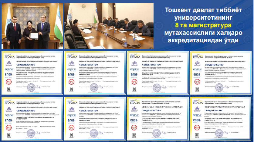 Маълумот ўрнида, халқаро аккредитация сертификатлари WFME ҳамда ECAQA маслаҳатчиси Фарида Нурманбетова томонидан соғлиқни сақлаш вазири Асилбек Худояров ҳамда Тошкент давлат тиббиёт университети ректори Шуҳрат Боймуродовга тантанали равишда топширилди.