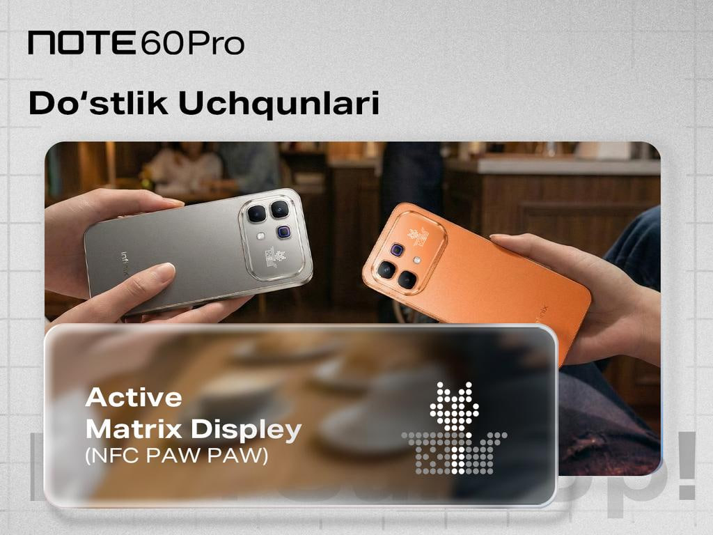 NOTE 60 Pro’нинг ажралиб турувчи хусусиятларидан бири — Matrix Display, яъни орқа панелдаги интерактив ёруғлик дисплейидир. У билдиришномалар, қувватланиш ҳолати, мусиқа ижро этилгандаги анимациялар ва бошқа визуал эффектларни акс эттириб, смартфон билан ўзаро алоқани янада кўргазмали ва шахсийлаштирилган қилади.