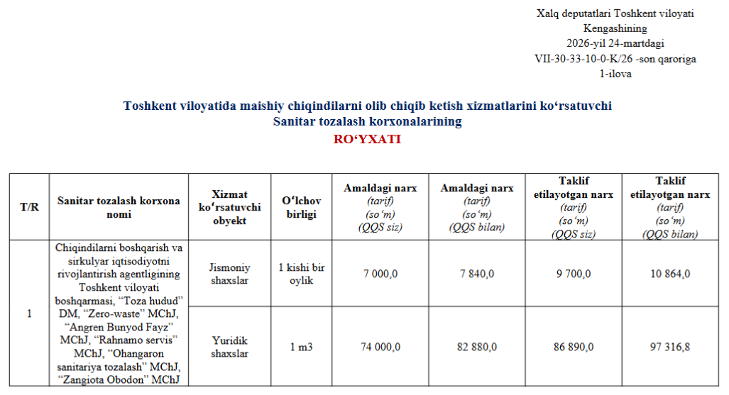 Халқ депутатлари Тошкент вилояти кенгаши 24 март кунги қарори билан қаттиқ маиший чиқиндиларни тўплаш ва олиб чиқиб кетиш хизмати учун янги тарифларни тасдиқлади.