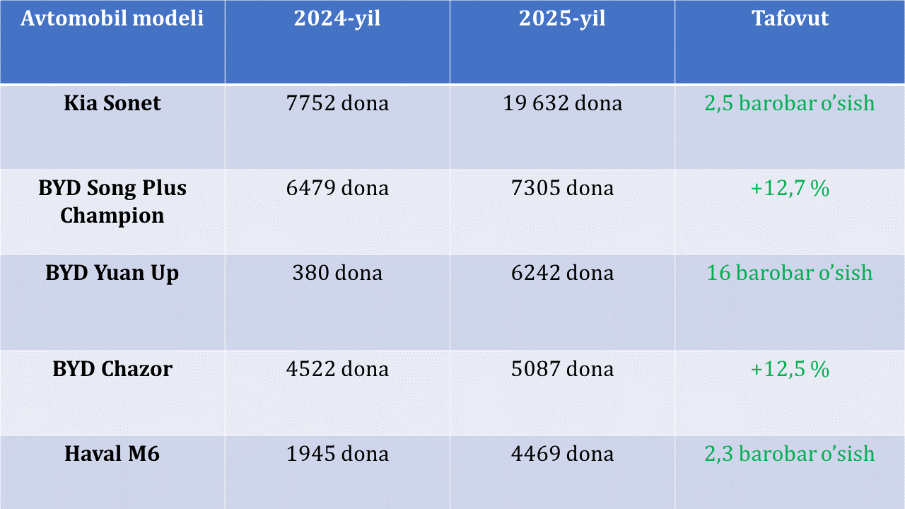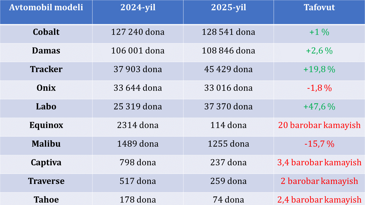 2025 йилда UzAuto Motors томонидан тақдим этилаётган 10 та моделдан 6 тасининг сотувлари камайган. Хусусан, қиммат сегментдаги машиналар: Malibu, Captiva, Equinox, Traverse, Tahoe’га талаб кескин тушиб кетди. Ҳисобот даврида Chevrolet брендига тегишли бўлмаган ва энг кўп сотилган автомобил – Kia Sonet. BYD ҳам умумий сотувлардаги улушини 3,8 фоиздан 5,7 фоизгача оширди.