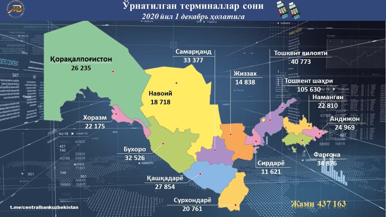 Ўзбекистон бўйлаб ўрнатилган тўлов терминаллари сони 437 163тани ташкил этмоқда. Бу ҳақда Марказий банк хабарида айтилган.