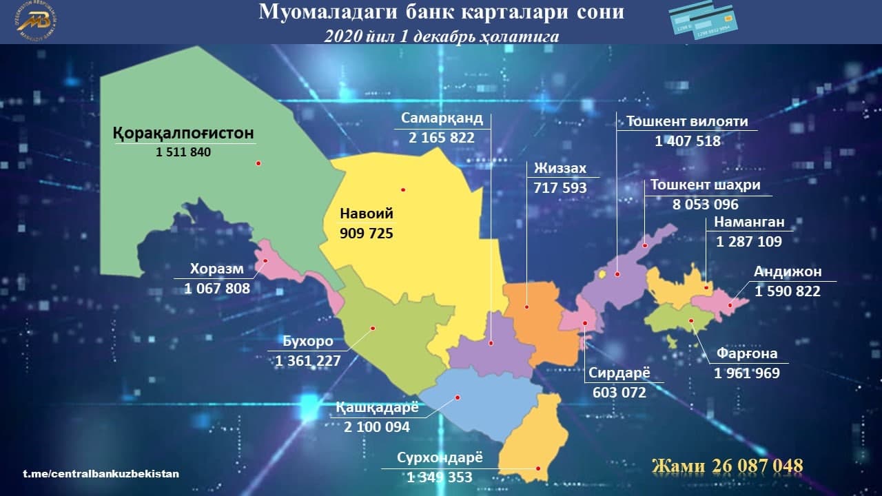 Муомаладаги банк карталари сони эса 26 млн.дан ошиб, ўтган йилнинг мос даврига нисбатан 5,9 млн. донага кўпайди.