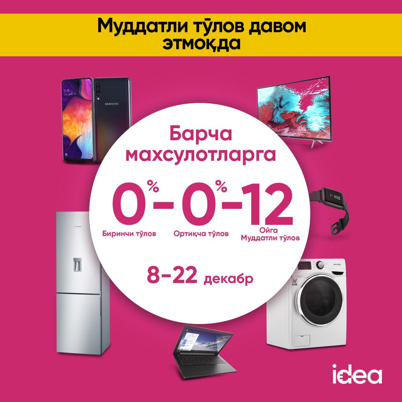 8 декабрдан 22 декабргача Idea маиший техника ва электроника дўконида 0-0-12 акцияси бўйича барча маҳсулотларга тезкор ва тайёр муддатли тўловни расмийлаштиришингиз мумкин.