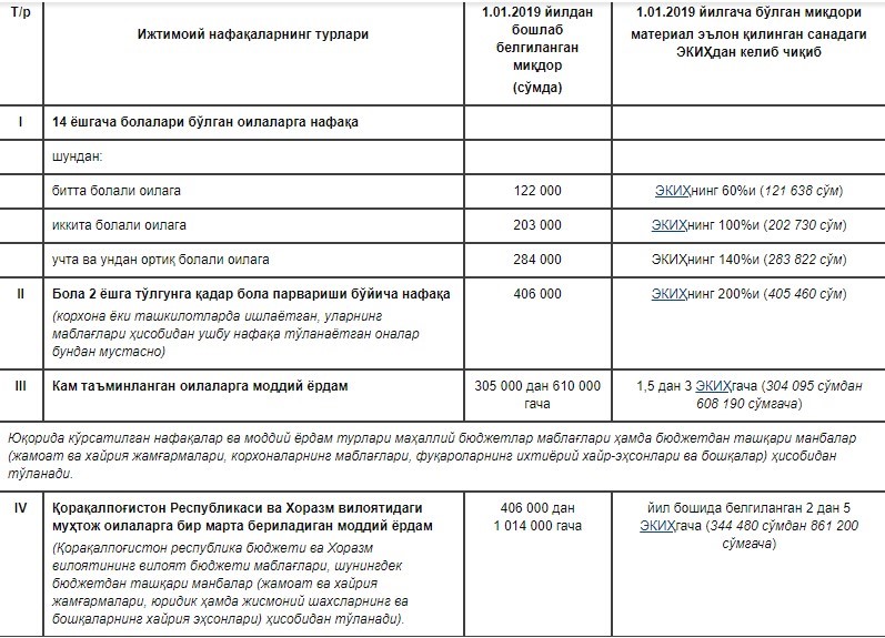 2019 йил 1 январдан бошлаб 14 ёшгача бўлган болалари бор оилаларга нафақалар, бола 2 ёшга тўлгунга қадар унинг парвариши бўйича нафақалар ва кам таъминланган оилаларга моддий ёрдам, Қорақалпоғистон Республикаси ва Хоразм вилоятидаги муҳтож оилаларга бир марталик моддий ёрдамнинг янги миқдорлари жорий этилади.
