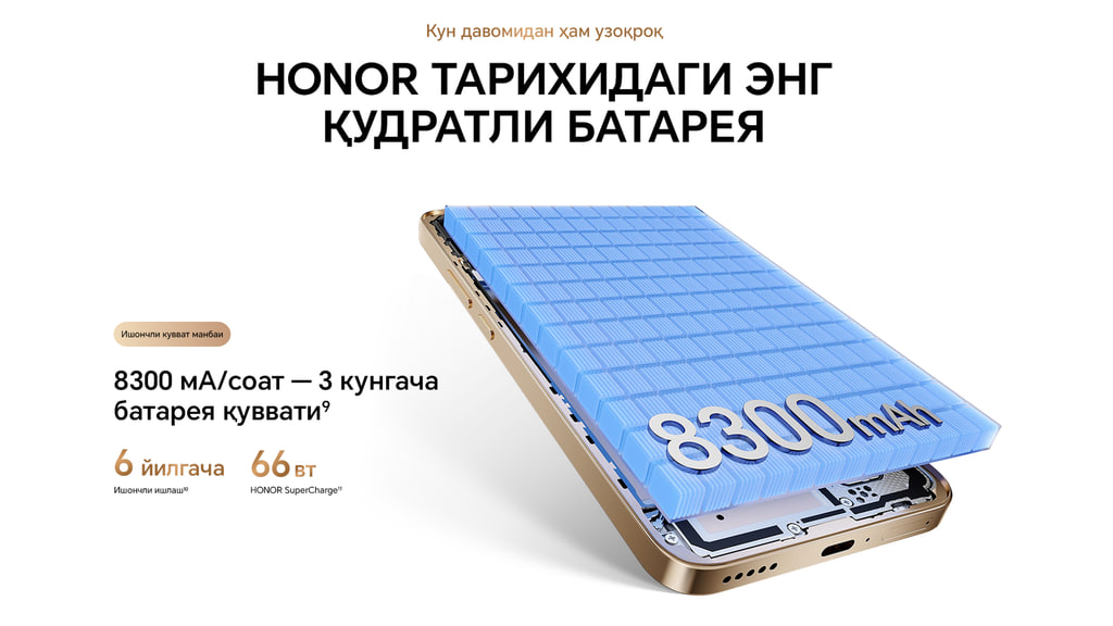 HONOR X9d 8300 мА·соатли силикон-карбон батарея билан жиҳозланган бўлиб, катта қувватни сақлаган ҳолда қурилманинг юпқалиги ва енгиллигини таъминлайди. Смартфон 3 кунгача фаол фойдаланишда қувватлашсиз ишлай олади, шунингдек, компаниянинг махсус энергия оптималлаштириш алгоритмлари батарея ҳажмининг 6 йил давомида 80% дан тушиб кетмаслигини кафолатлайди. Такомиллашган ҳарорат назорати батареянинг -30°C дан 55°C гача бўлган ҳарорат шароитида самарали ишлашини таъминлайди. Бундан ташқари, Ultra Power Saving режими батарея қуввати 2% бўлса ҳам 60 дақиқагача овозли алоқа қилиш имконини беради. HONOR X9d 66W симли HONOR SuperCharge тез зарядлаш ва бошқа қурилмаларни 7,5W симли акс зарядлаш билан қўллаб-қувватлайди.