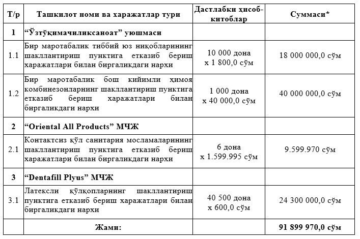 Ўзбекистонда сотиб олинадиган зарур шахсий ҳимоя воситалар ва тиббий жиҳозларни шакллантирилиши ва юборилиши билан боғлиқ харажатлар Ўзбекистон Республикаси Вазирлар Маҳкамасининг захира фонди ҳисобидан, Россия Федерациясида сотиб олинадиган қисми Ўзбекистон Республикасининг Россия Федерациясидаги элчихонасининг махсус ҳисоб-варағидаги мавжуд ҳомийлик маблағлари ҳисобидан амалга оширилади.