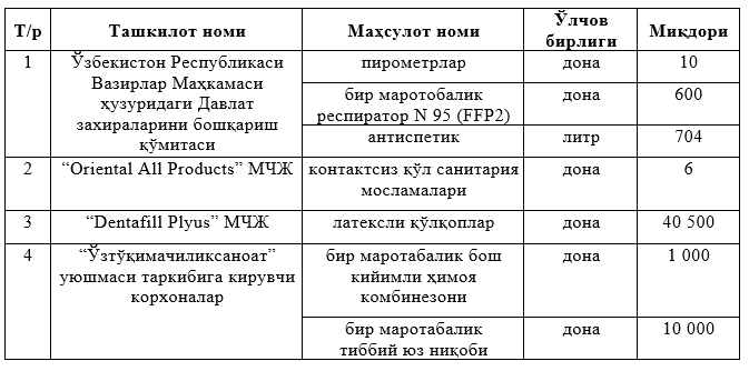 Ўзбекистон Республикаси Вазирлар Маҳкамаси ҳузуридаги Давлат захираларини бошқариш қўмитаси, “Ўзтўқимачиликсаноат” уюшмаси ва Фармацевтика тармоғини ривожлантириш агентлиги билан биргаликда Ташқи ишлар вазирлиги талабларига асосан шахсий ҳимоя воситалар ва бошқа тиббий жиҳозлар зарур ҳажмда шакланиши ва юборилиши ташкил этилади.