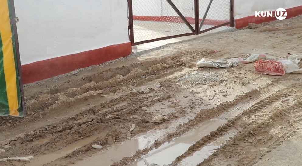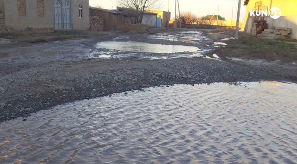 Чироқчи туманидаги янги намунали уйлар қурилган кўчага кириб борар эканмиз, ерга асфальт ётқизилмаганига гувоҳ бўлдик. Ёмғир ёғганлиги сабабли тўпланиб қолган сув ва лойни кечиб ўтишимизга тўғри келди. Ваҳоланки, бу ҳудудда фуқаролар истиқомат қилишни бошлаганига 2 йилдан ошган.