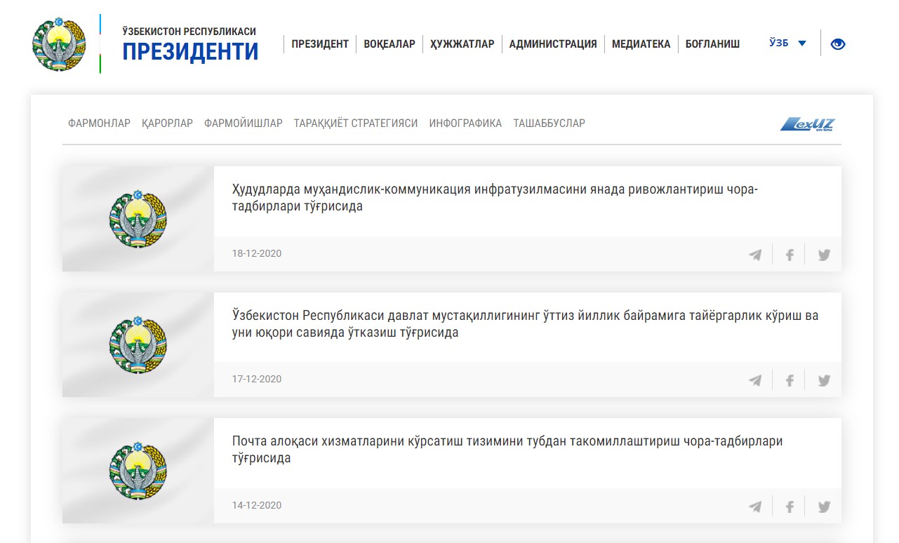 Президент расмий сайти дизайни янгиланди. Унда президент администрациясига оид маълумотлар пайдо бўлди