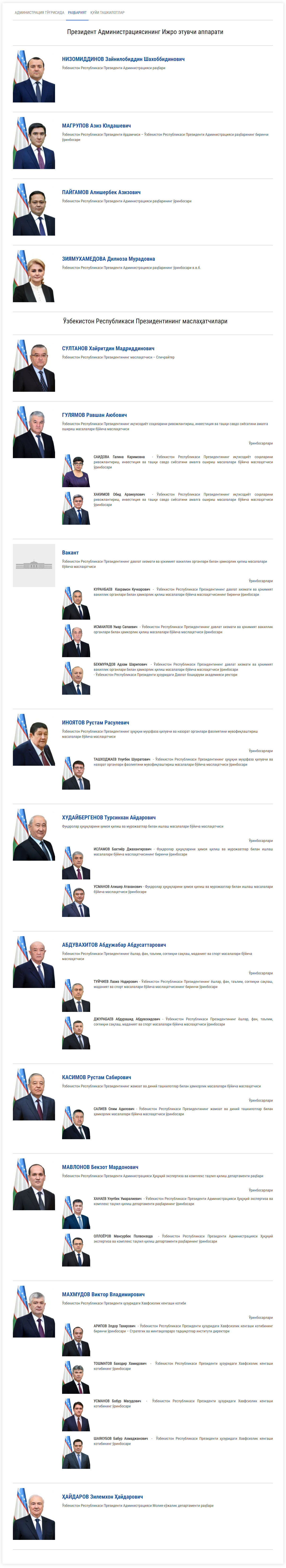 Ўзбекистон Республикаси президентининг расмий веб-сайти – president.uz янги форматда ишга туширилди. Сайтнинг янги версиясида Президент Администрациясининг Ижро этувчи аппарати раҳбарлари, маслаҳатчилар, департамент раҳбарлари ҳақида ҳам маълумот берилган.