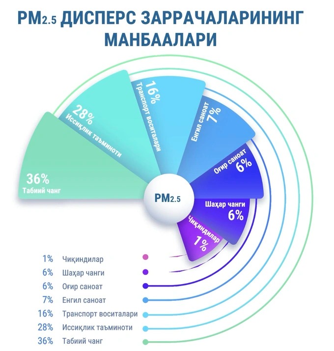 2024 йил май ойида Экология вазирлиги Жаҳон банки билан ҳамкорликда Тошкент шаҳридаги ҳаво сифатини баҳолаш ишларининг дастлабки натижаларини маълум қилганди. Унга кўра, пойтахтда РМ2.5 зарраларининг манбалари қуйидагича: табиий чанг – 36 фоиз; иссиқлик таъминоти – 28 фоиз; транспорт воситалари – 16 фоиз; саноат корхоналари – 13 фоиз; шаҳар чанги – 6 фоиз; чиқиндилар – 1 фоиз.