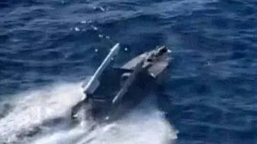 Унда денгиз дрони вертолётга ўрнатилган пулемёт зарбалари остида уни нишонга олгани, вертолёт эса зарбадан кейин денгизга қулагани акс этган, у ҳимояланиш учун ўзидан иссиқлик тузоғи тарқатган, аммо бу катта эҳтимол билан ракета текканидан кейин бўлган.