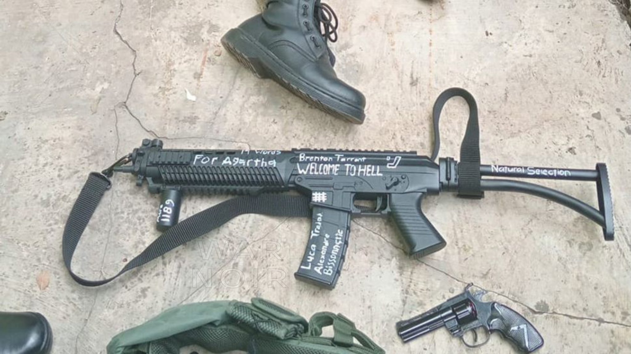 Автомат қуролга ўхшаш буюмда «Brenton Tarrant. Welcome to Hell» – «Брентон Таррант. Дўзахга хуш келибсан» деган ёзув бор эди. Брентон Таррант – 2019 йилда Янги Зеландиядаги Ислом марказига ҳужум қилиб, 51 кишини ўлдирган террорчи ҳисобланади.