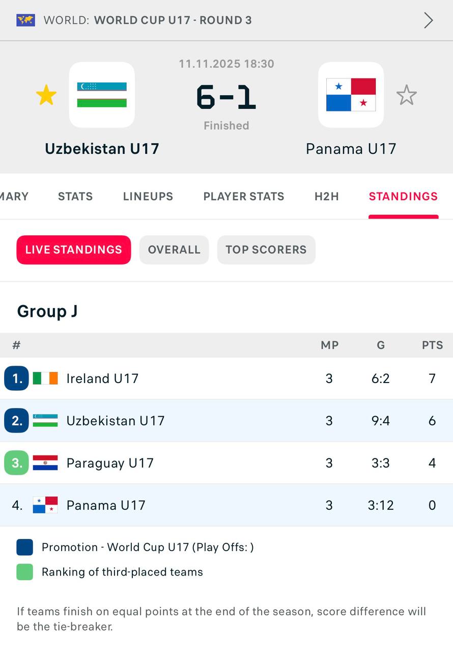 J гуруҳида Ўзбекистон U17 жамоаси 11 ноябр куни гуруҳ босқичининг 3-тури доирасида Панамани 6:1 ҳисобида енгди.