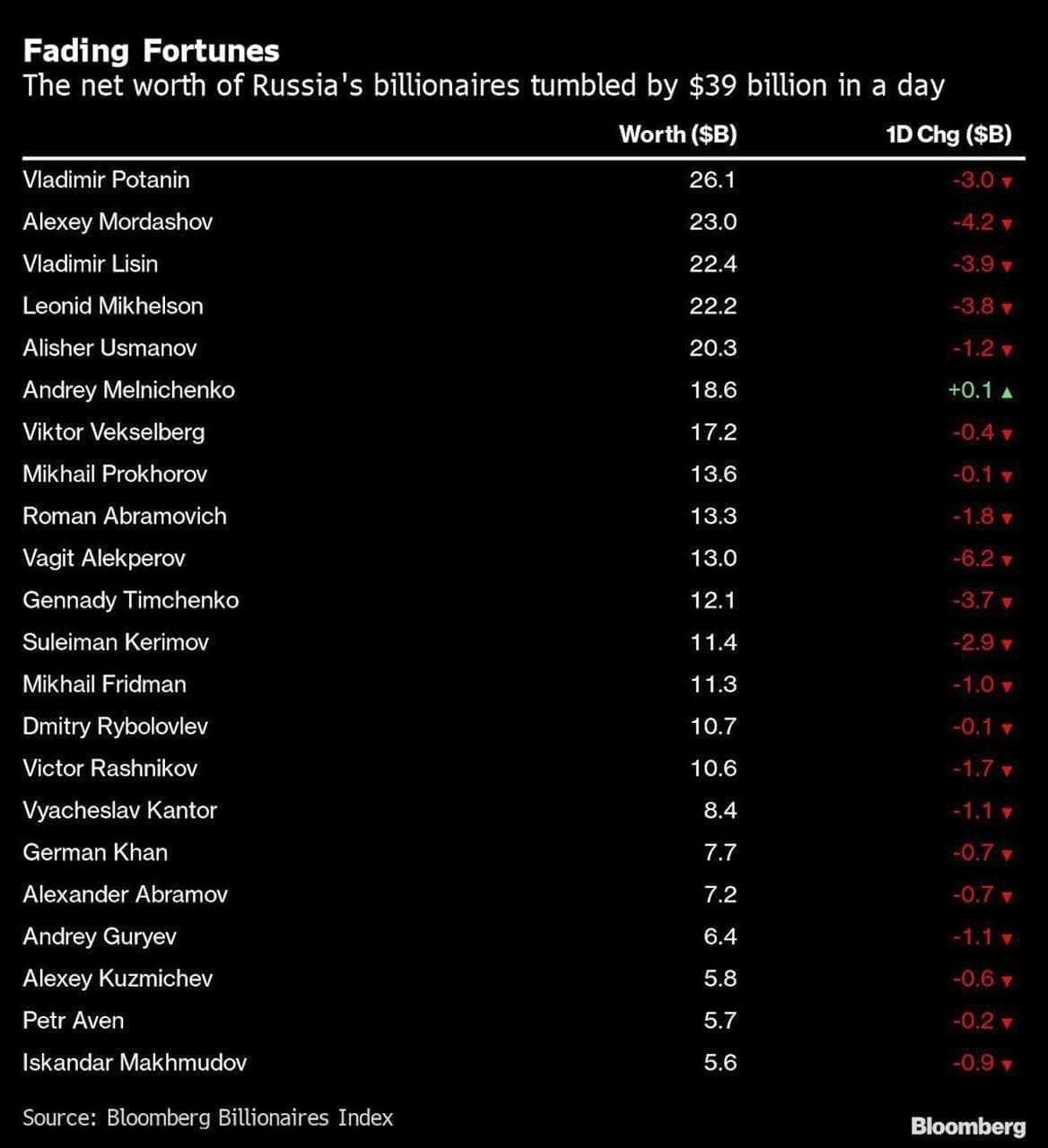 Bloomberg индексида энг бой россиялик сифатида қайд этилган Norilsk Nikel президенти Владимир Потанин қарийб 3 миллиард доллар йўқотган. (Унинг бойлиги 26,1 миллиард долларгача камайган). Severstal директорлар кенгаши раҳбари Алексей Мордашовнинг зарари эса 4,2 миллиард долларни ташкил қилган ва умумий бойлиги 23 миллиард долларгача камайгани қайд этилган.