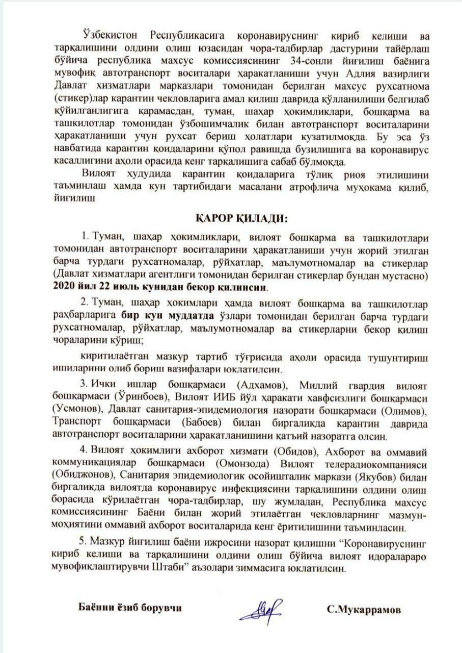 Жумладан, Фарғона вилоят ҳокими ўринбосари Ф. Қосимов томонидан имзоланган 166/0149-сонли йиғилиш баёни (2020 йил 21 июль) шу мақсадни кўзда тутади. Яъни ҳоким ўринбосарининг бу қарорида коронавирус тарқалишининг олдини олиш мақсадида маҳаллий ҳокимликлар томонидан тадбиркорларга берилган ҳар қандай рухсатномаларни бекор қилиш топширилган.