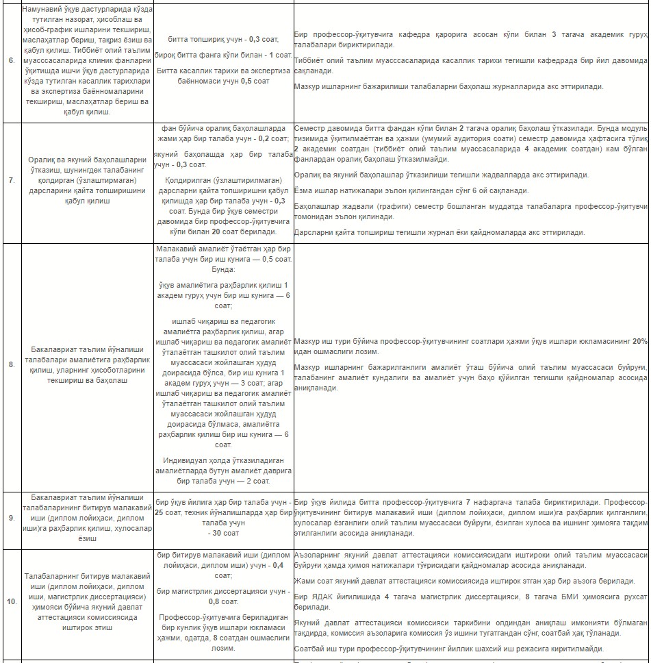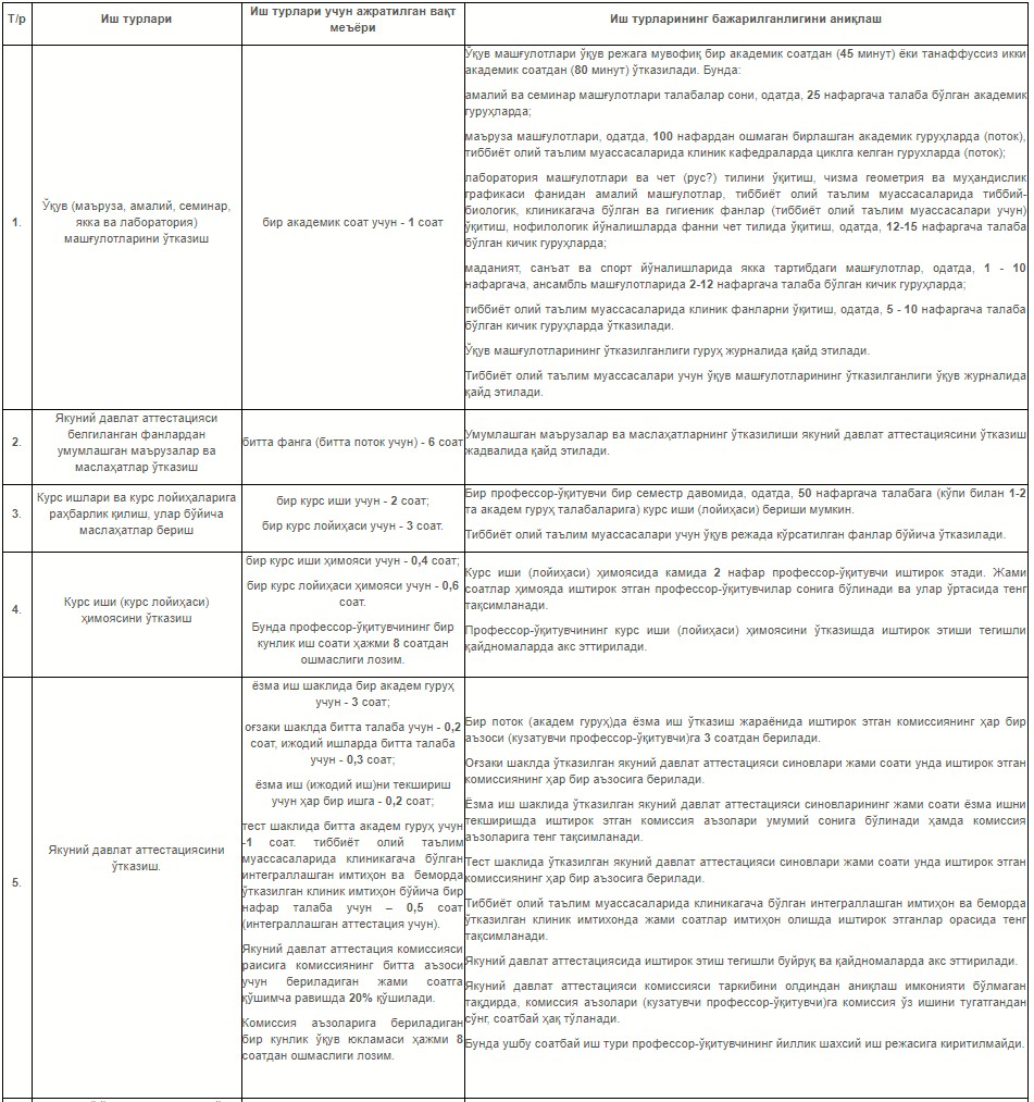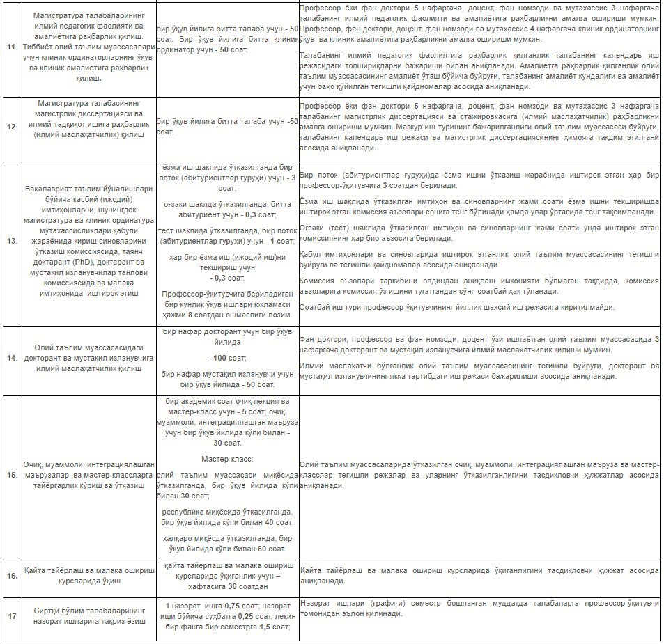 Ҳужжат билан олий таълим муассасаси профессор-ўқитувчилар таркибининг ўқув юкламаси ҳамда ўқув-услубий, илмий-тадқиқот, ташкилий ва маънавий-маърифий ишларини белгилаш қоидалари тасдиқланиши мумкин.