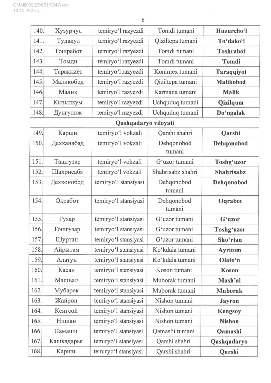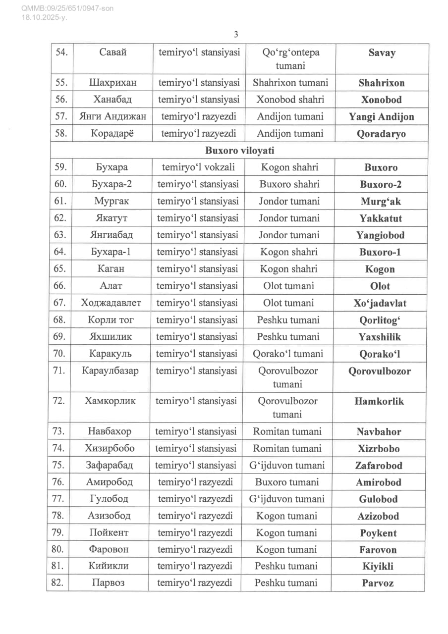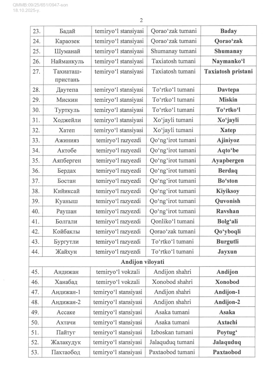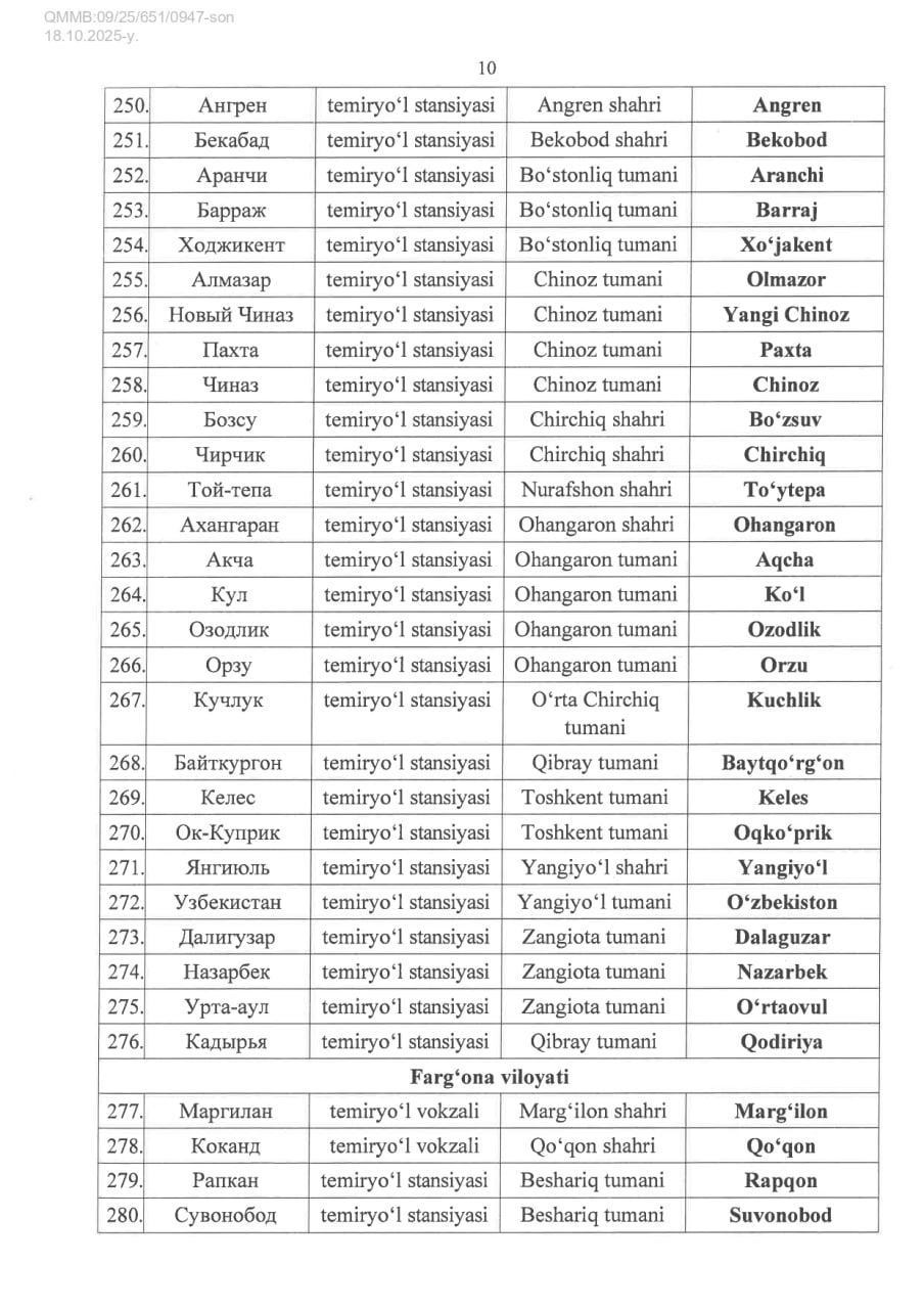 Номи давлат тили қоидаларига мослаштириладиган объектлар рўйхатига Қорақалпоғистон Республикаси, вилоятлар ва Тошкент шаҳридаги жами 320 та вокзал, станция ва разъездлар киритилган.