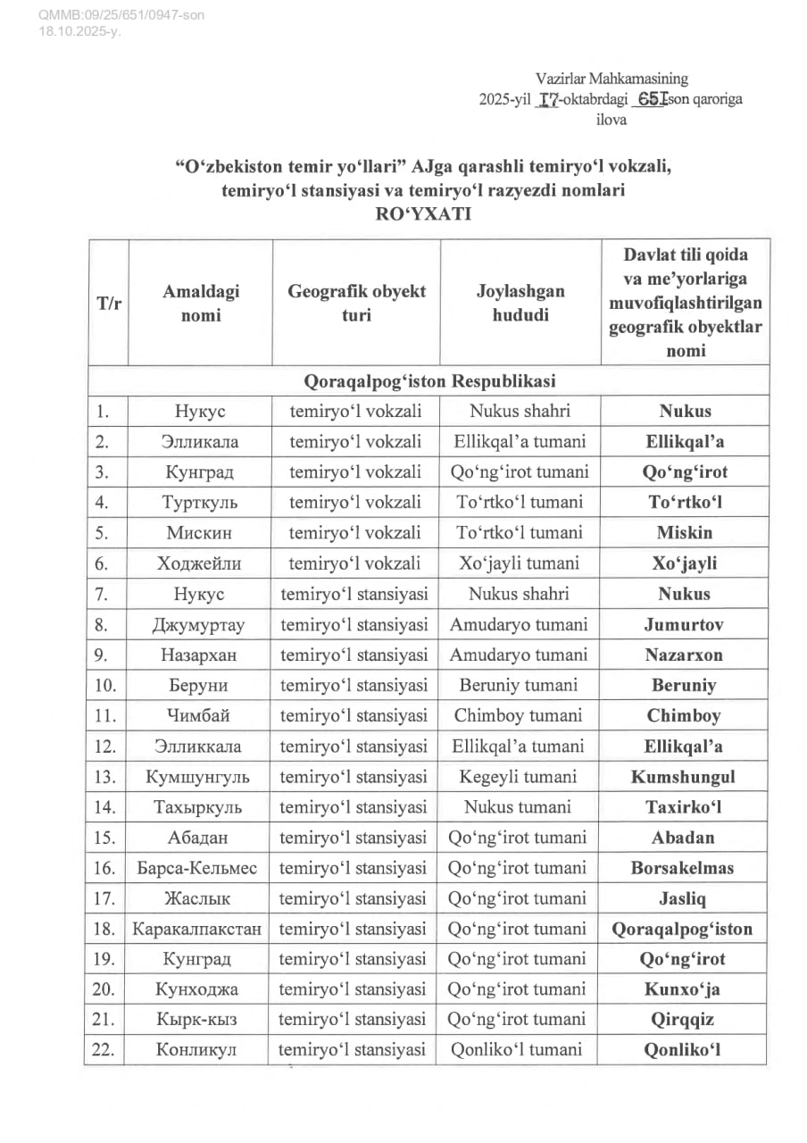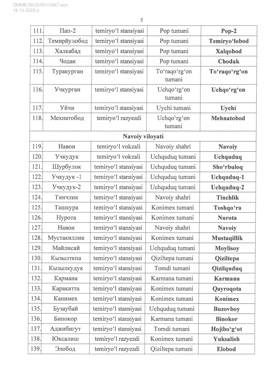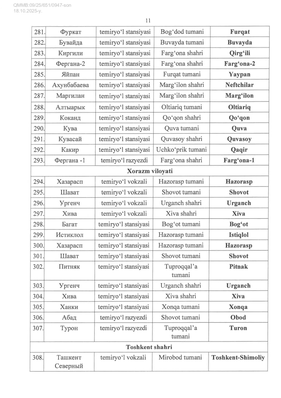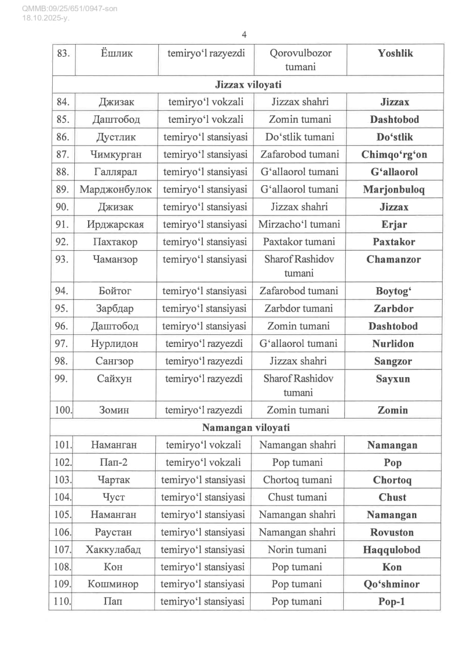 Номи давлат тили қоидаларига мослаштириладиган объектлар рўйхатига Қорақалпоғистон Республикаси, вилоятлар ва Тошкент шаҳридаги жами 320 та вокзал, станция ва разъездлар киритилган.