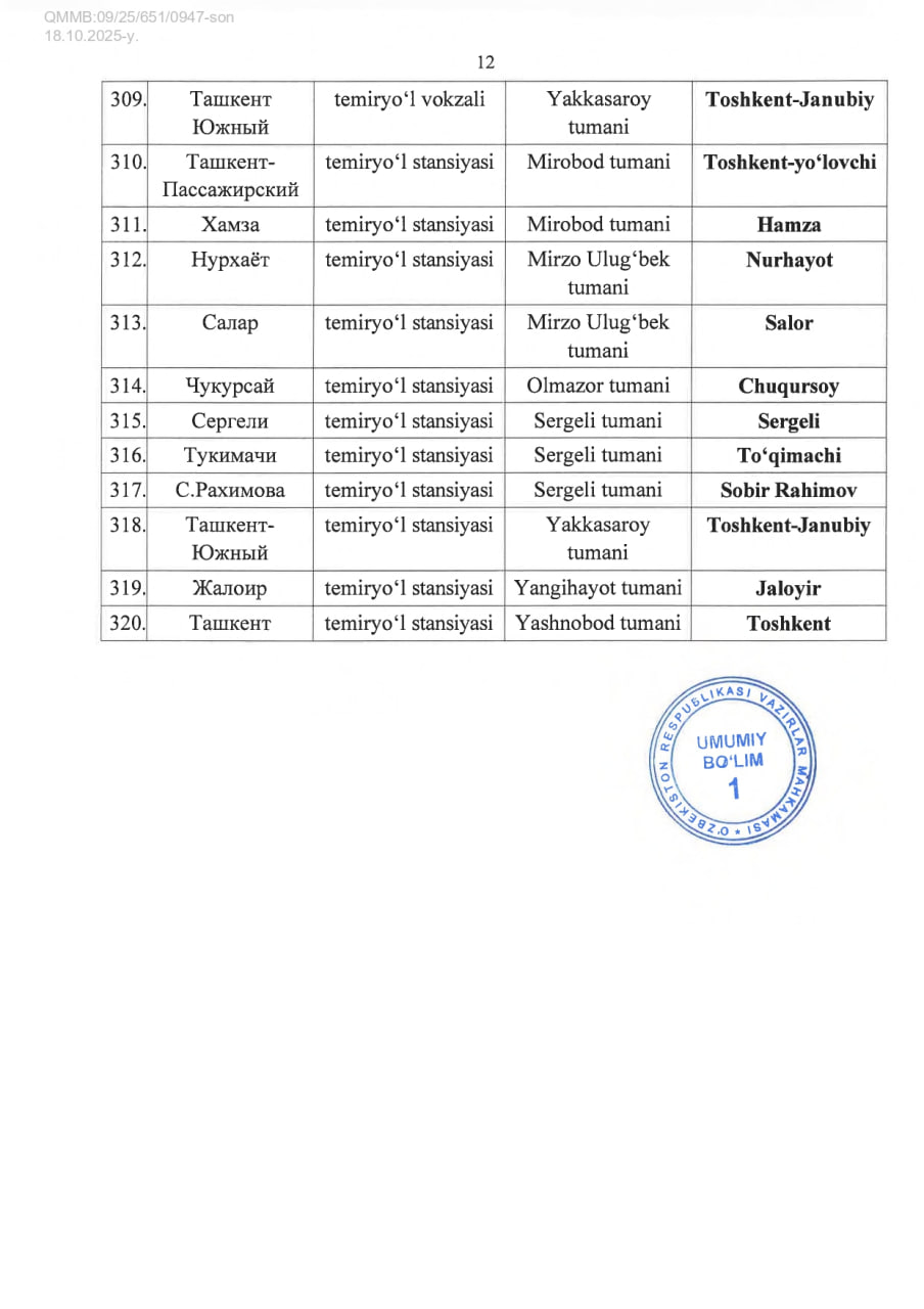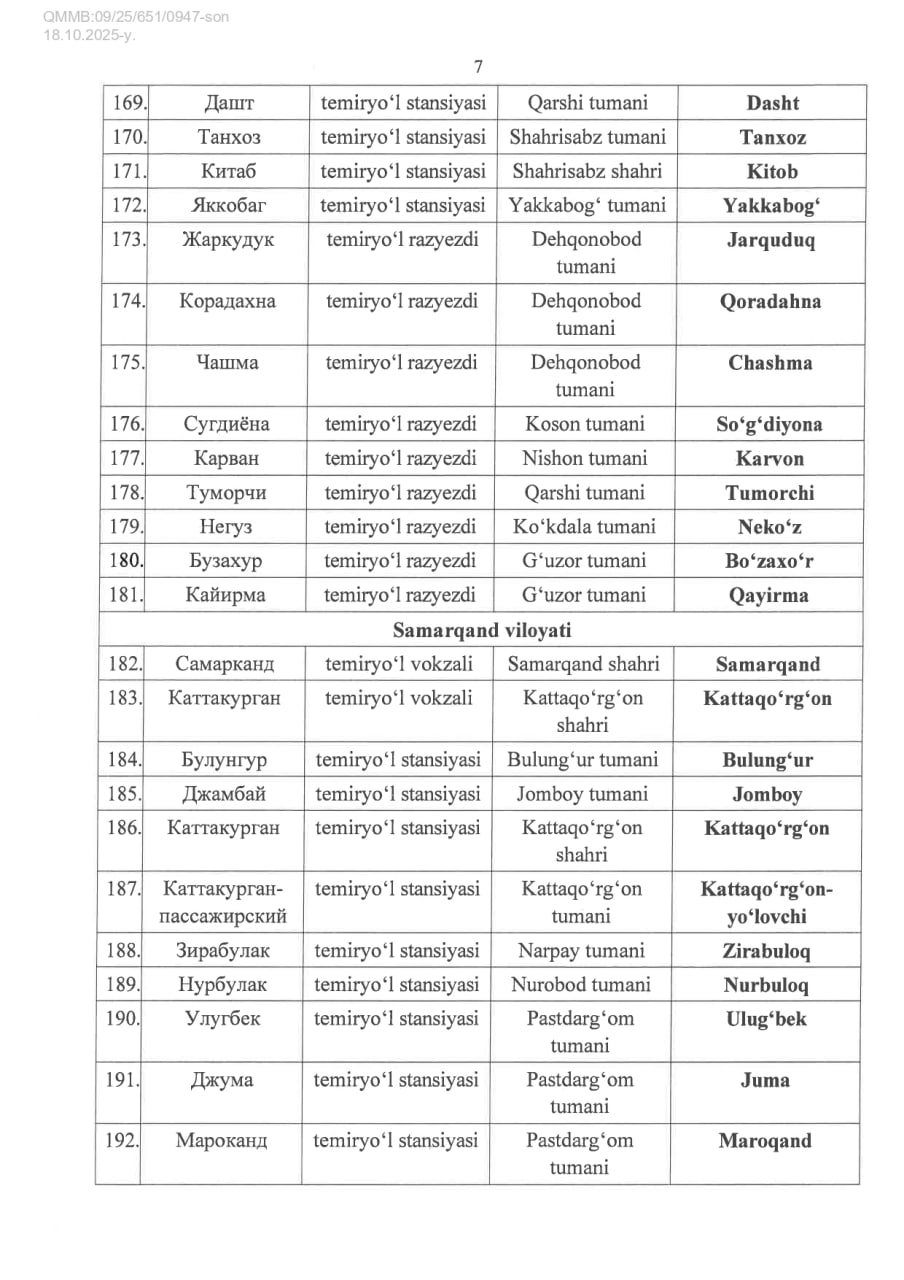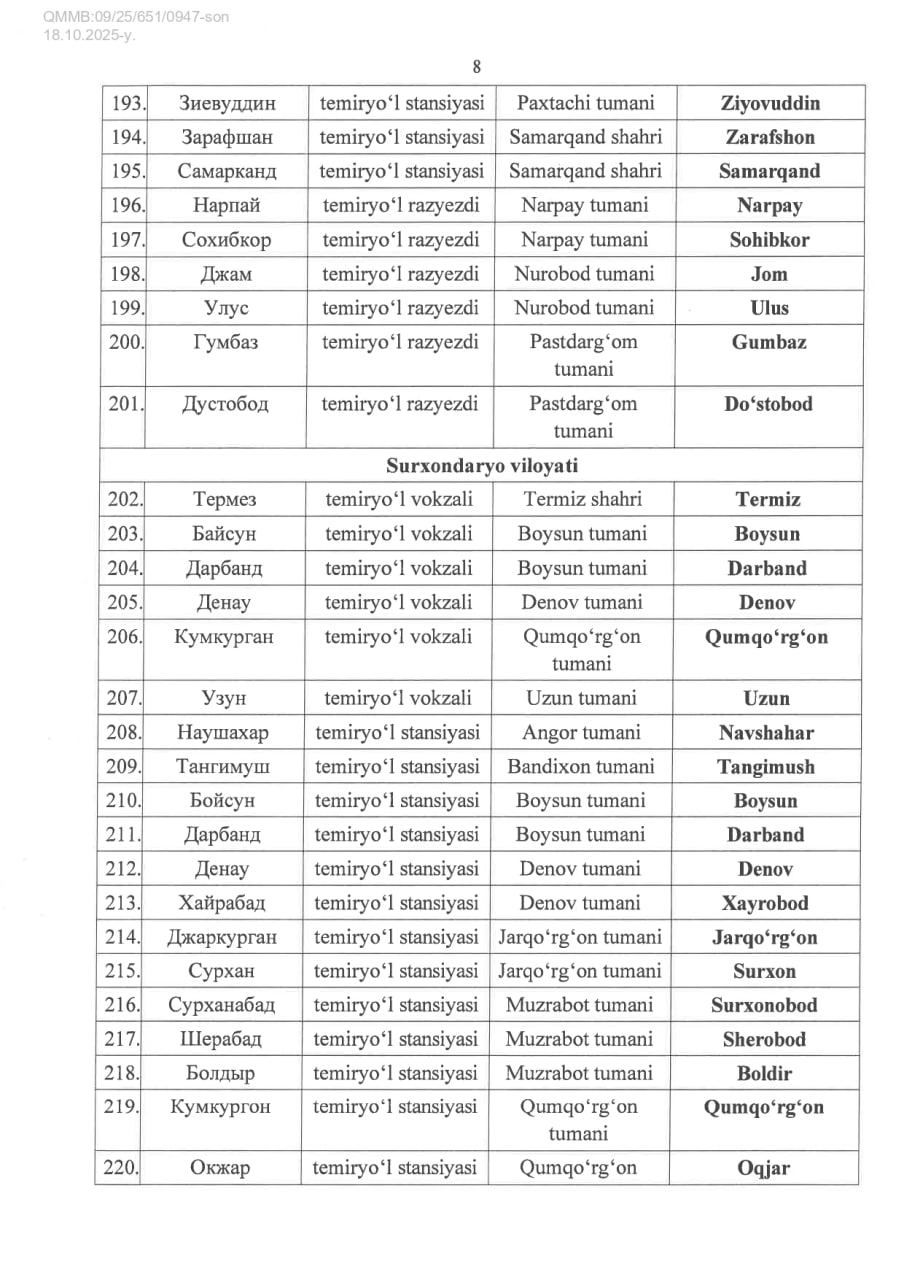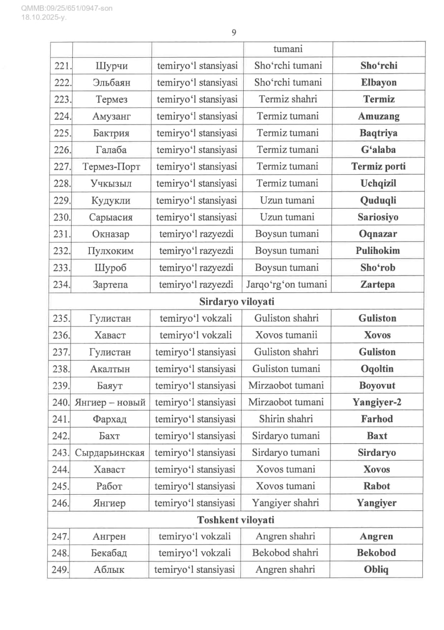 Номи давлат тили қоидаларига мослаштириладиган объектлар рўйхатига Қорақалпоғистон Республикаси, вилоятлар ва Тошкент шаҳридаги жами 320 та вокзал, станция ва разъездлар киритилган.