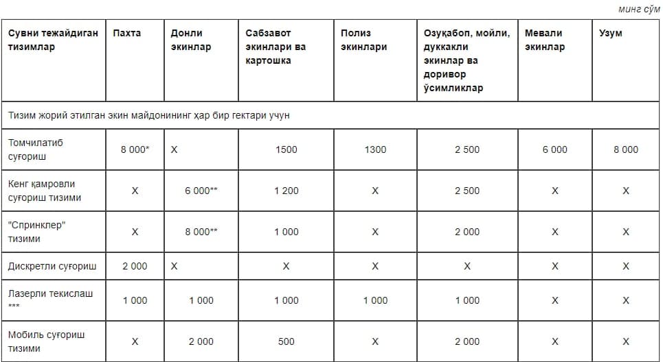Қорақалпоғистон Республикаси ва Хоразм вилоятидаги донли экинлар етиштириш майдонларида жорий этилган кенг қамровли ҳамда "спринклер" тизимлари учун 9 000 минг сўм этиб белгиланади.