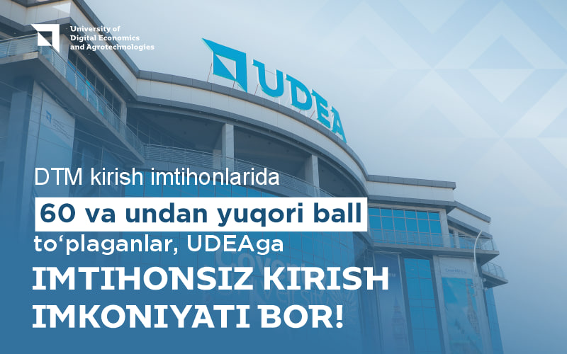 Давлат тест синовларидан 60 ва ундан юқори балл тўплаган абитуриентлар Рақамли иқтисодиёт ва агротехнологиялар университетида (UDEA) бакалавриатнинг қуйидаги йўналишларига имтиҳонсиз қабул қилинади: