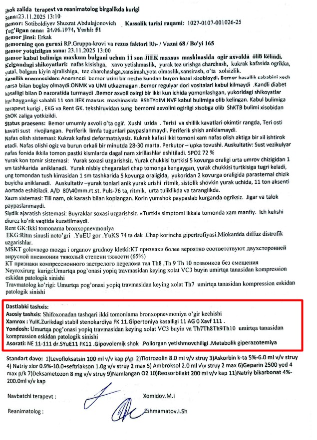 “Дадамнинг олдига 24 ноябр куни кирдим. Бўйин шиши ва ҳолатига қараб, шифокорларга дадамни уришганини, қовурғалари синганини айтдим. Лекин улар яширишди. Таҳлил жавобларини беринглар, бошқа шифокорларга ҳам кўрсатай, дея илтимос қилдим, ялиниб-ёлвордим. Аммо алдашди. Калтаклашган бўлса ҳам вақтида олиб келишганида, шифокорлар улардан эмас, ичган қасамидан кўпроқ қўрқишганида балки дадам тузалиб кетарди”, дейди марҳумнинг қизи.