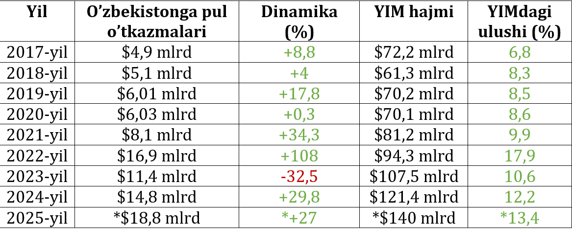 Меҳнат мигрантлари юборган пуллар узоқ йиллардан бери Ўзбекистон иқтисодиётида муҳим ўрин тутиб келади ва аҳоли турмуш харажатларининг сезиларли қисмини қоплайди. Хусусан, 2024 йилда мамлакатга 14,8 млрд долларлик пул ўтказмалари кириб келган. Бу ялпи ички маҳсулотнинг 12,2 фоиздан кўпроқ қисмини ташкил этади. Таққослаш учун, ўтган йили Ўзбекистон экспорт қилган олтиннинг умумий қиймати 7,5 млрд доллар бўлган.