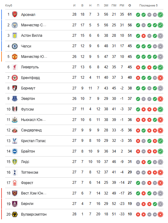 Қизиллар ўйинларнинг сўнгги 15 дақиқасида урилган голлар сони (15) бўйича АПЛда яққол устунлик билан олдинда бормоқда. Жамоа ҳамон турнир жадвалида олтинчи ўринда қолмоқда, аммо бу турда «Бёрнли»ни енга олмаган «Челси» ва ўз ўйинини энди ўтказадиган «МЮ» билан очколари сони тенг.