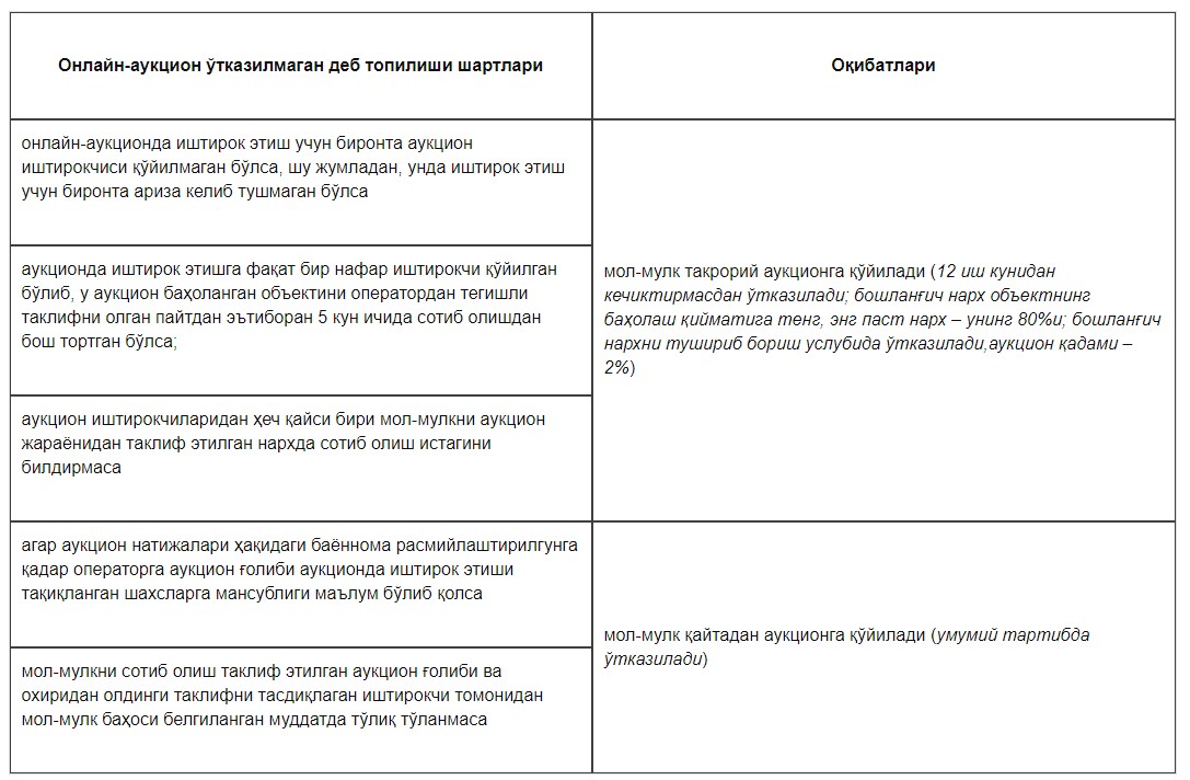 Муайян ҳолатларда онлайн-аукцион ўтказилмаган деб топилиши мумкин.