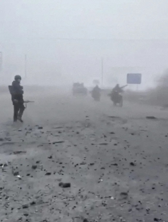 Ижтимоий тармоқларда россиялик ҳарбийлар колоннаси қалин туман тушганидан фойдаланиб, шаҳарга кириб олгани акс этган кадрлар тарқалди. «Душман муваффақиятни ривожлантирмоқда. Душман денгиз сувидек мўл», дея вазиятни тасвирлайди украин ҳарбийларидан бири.