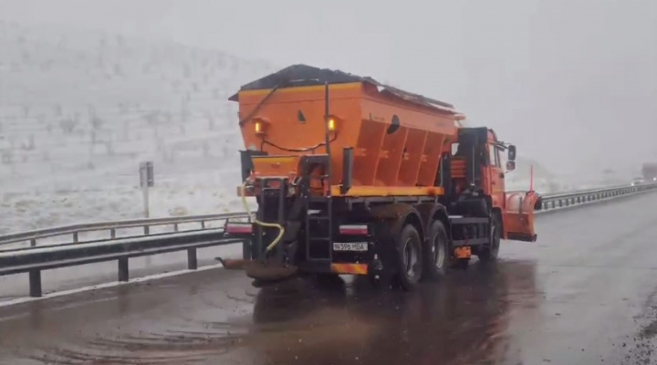 Қамчиқ довонида қор ёғмоқда: йўлларга қум-туз аралашмаси сепилмоқда