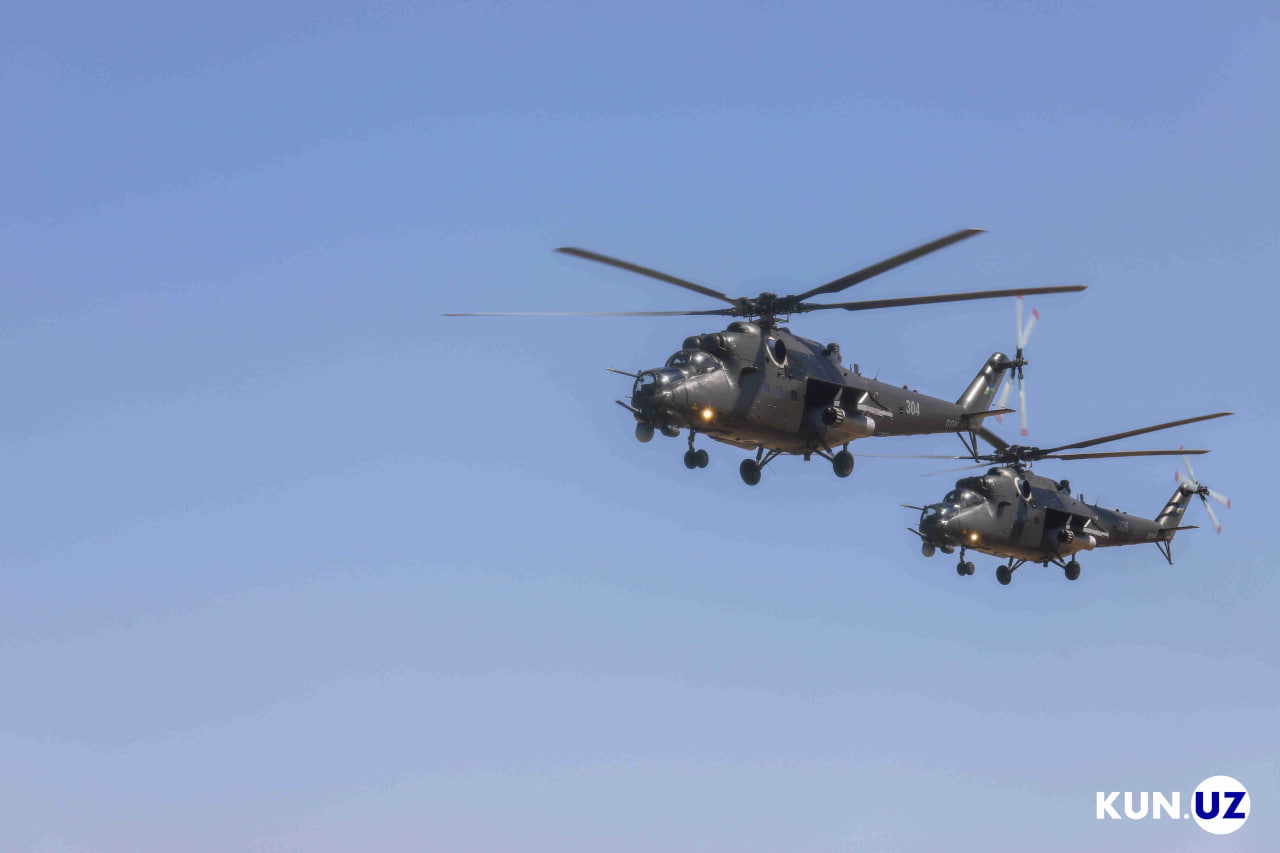 Шоуда СССР давридаги энг машҳур МИ-24 жанговар вертолётлари ҳам чиқиш қилди.