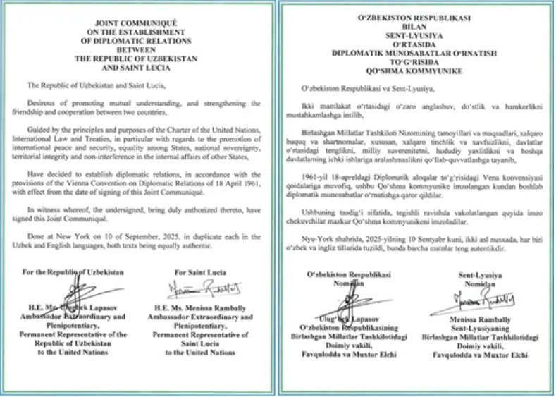 Кеча Ню-Йорк шаҳрида Ўзбекистон билан Сент-Люсия ўртасида дипломатик муносабатлар ўрнатиш тўғрисида қўшма коммюнике имзоланди.